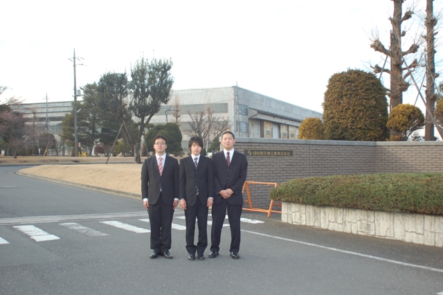 どうもみなさんこんばんわ. 最近,研究室で寝るときに 非常口案内の緑色の 光がまぶしい 下野です. 今日の活動は2グループあります. 1.スポンサー企業さまでの報告会(大沼・松本・大島・小山) 2.工作センタでの加工(吉原・下野・新妻) まずはは部品提供スポンサーである 「昭和飛行機工業株式会社」様に 人生初めて企業でのプレゼンをした 大島さんに序盤をお願いしました. というわけで久々にblog書きます 大島です. 本日はIAで使用しているアルミハニカム材を支援していただいてる 昭和飛行機様にIAの設計・製作についてプレゼンさせていただきました. プレゼン中の様子を写真でお伝えしたいですが 構内写真撮影禁止でした. プレゼンの内容としては 1,CIT-03のIA製作について 2,CIT-04のIA設計について 3,製作について質問 でした. プレゼン始まる直前はいっぱいいっぱいでほとんど覚えていません プレゼンについてですが,テンパって早口になってしまい ちゃんと自分のいいたいことが伝わっているのか今でも心配です. 小山さんのしっかりとした態度で行うプレゼンを見ていると経験も器量も違い 自分ももっと精進しなければいけないなと実感しました. 製作に関して疑問に思っていたところも今回の訪問で解決できました. 昭和飛行機の萩原様,荻原様お忙しいところありがとうございました. 最後に昭和飛行機前で記念撮影?(撮影者:小山)をしたのでアップして報告とします. (左)大沼・(中央)松本・(右)大島 それではお待たせしました,下野氏のblogへどうぞ