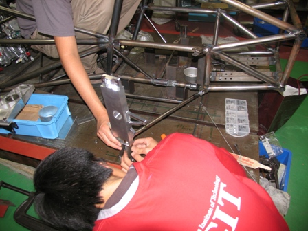 どうも、お久しぶりです。 フレーム担当の吉原です 今日は昭和の日らしいですが関係ありません さて本日行った作業ですが、工作センターが使えないので ずーっとフレームの溶接をしていました 最近気づいたんですが溶接の光を浴びすぎるとお手軽に日焼けできますよ 顔の皮がペリペリになりました。 フレームの本溶接も残りわずかなのでがんばりたいと思います 溶接する機会が結構増えたので技術が上がったかと思っていたんですが 調子に乗ってヘッドレストプレートを曲げてしまいました もっと溶接がうまくなりたいなー 最後になりましたが私たちに新しい仲間が増えました。 95パーセンタイルテンプレートのカズキ君(写真の左側にいる丸板と棒でできているやつ)です これからは彼も一緒にがんばってもらいたいと思います。 ちなみに次のブログは MJです それでは皆さんさようなら